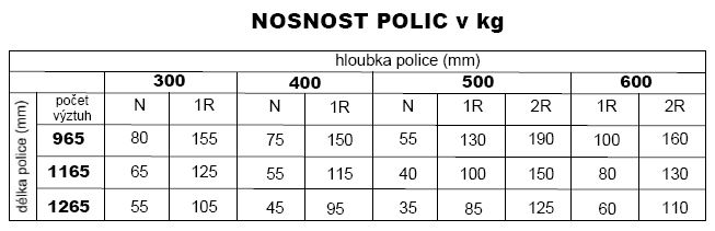 | Délka polic: | 965, 1165 a 1265 mm |